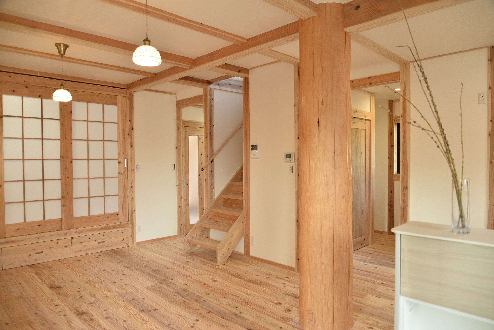丸太の柱が佇む、木が香るリビングが