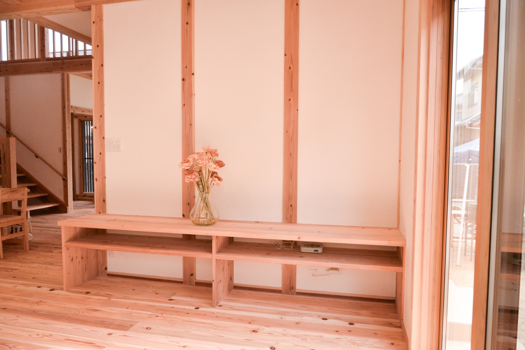 キッチンやカップボードも、音響熟成木材で出来ています。天板部分も木で仕上げてあるのは、水に強く、腐りにくい音響熟成木材ならでは。キッチンのすぐ横がダイニングテーブルなので食器の上げ下げもスムーズです。リビングにはやわらかい光が入り込みます。テレビボードは造り付けています。